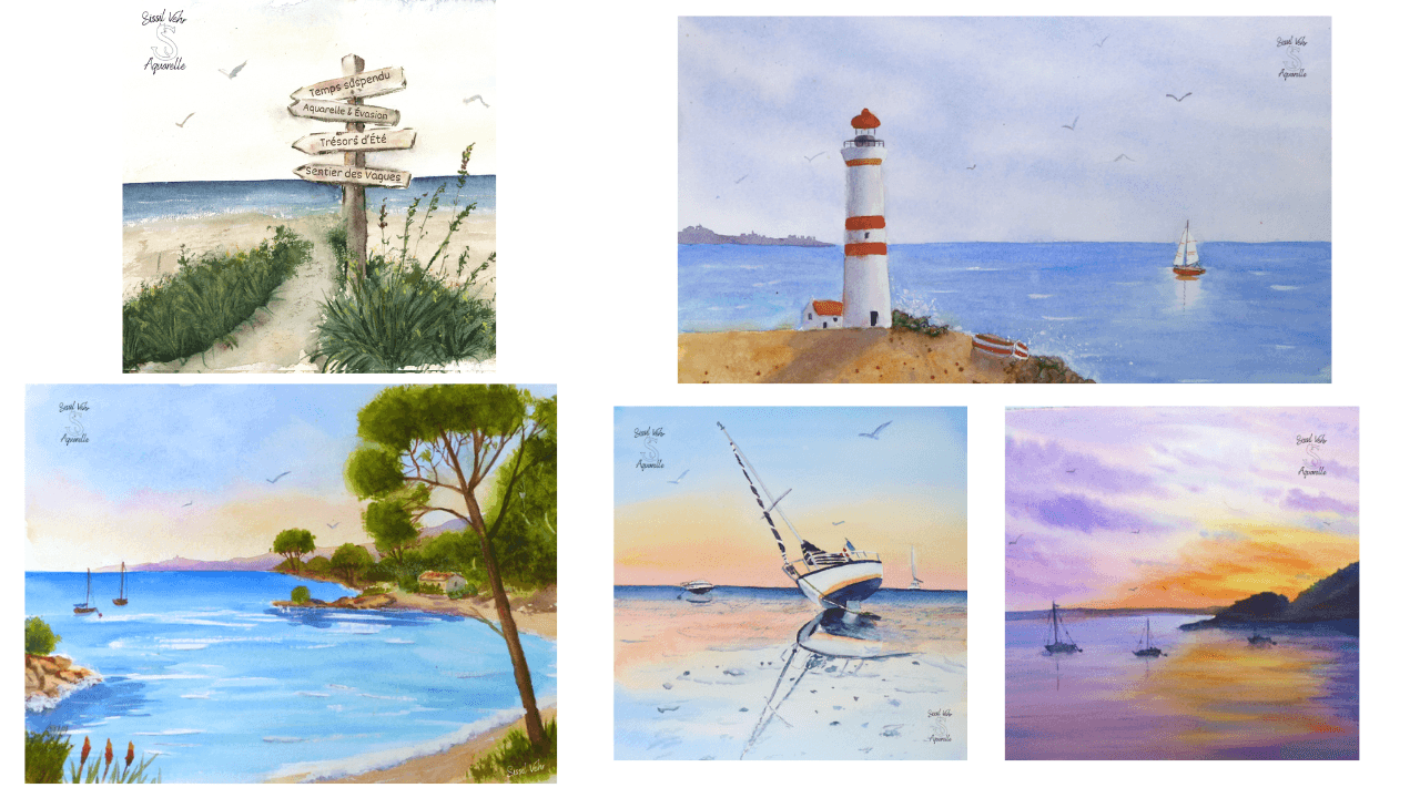 3 ou 5 paysages marins à peindre pas à pas, avec un fil conducteur clair pour garder la lumière et l’équilibre.
