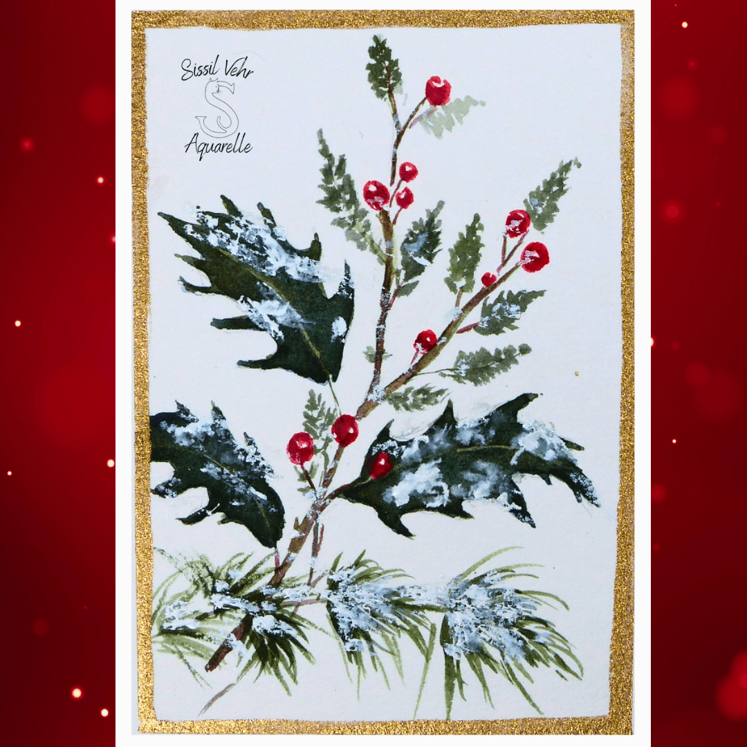 Peignez une branche de houx à l’aquarelle : lavis profonds, baies rouges lumineuses et gestes simples pour une carte de Noël élégante
