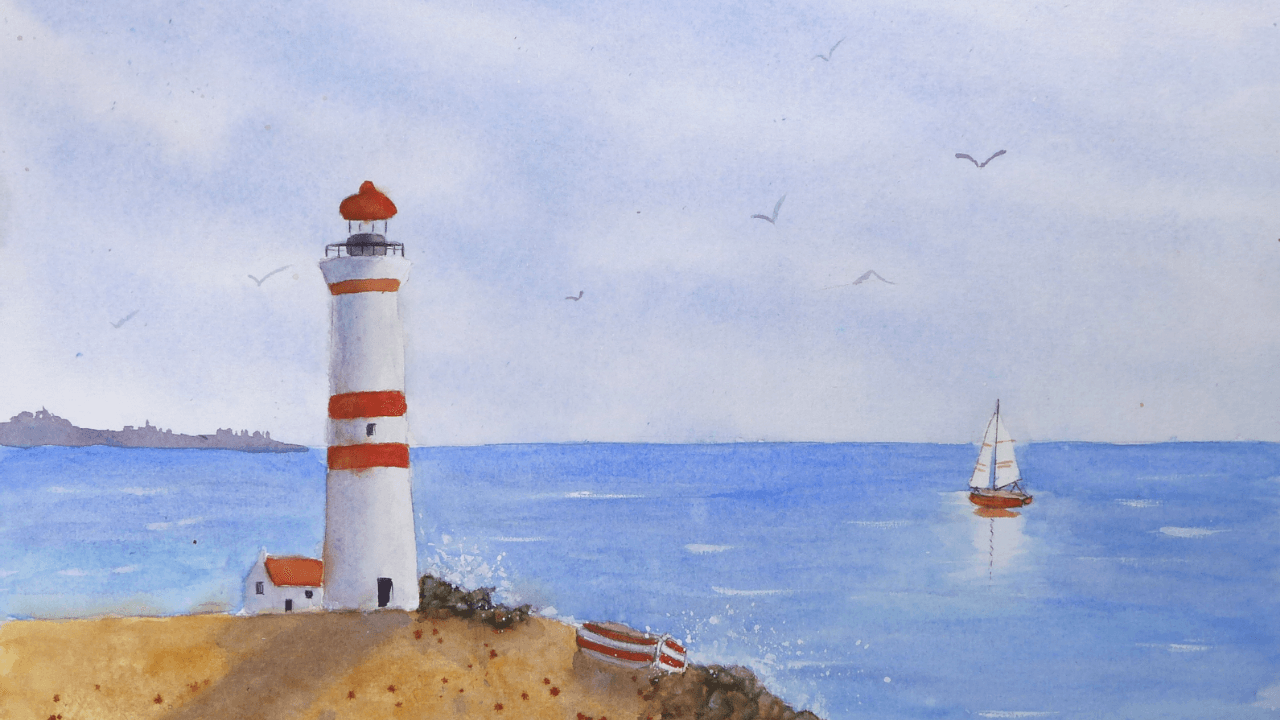 Un phare posé face à la mer, une scène simple et forte, guidée étape par étape.